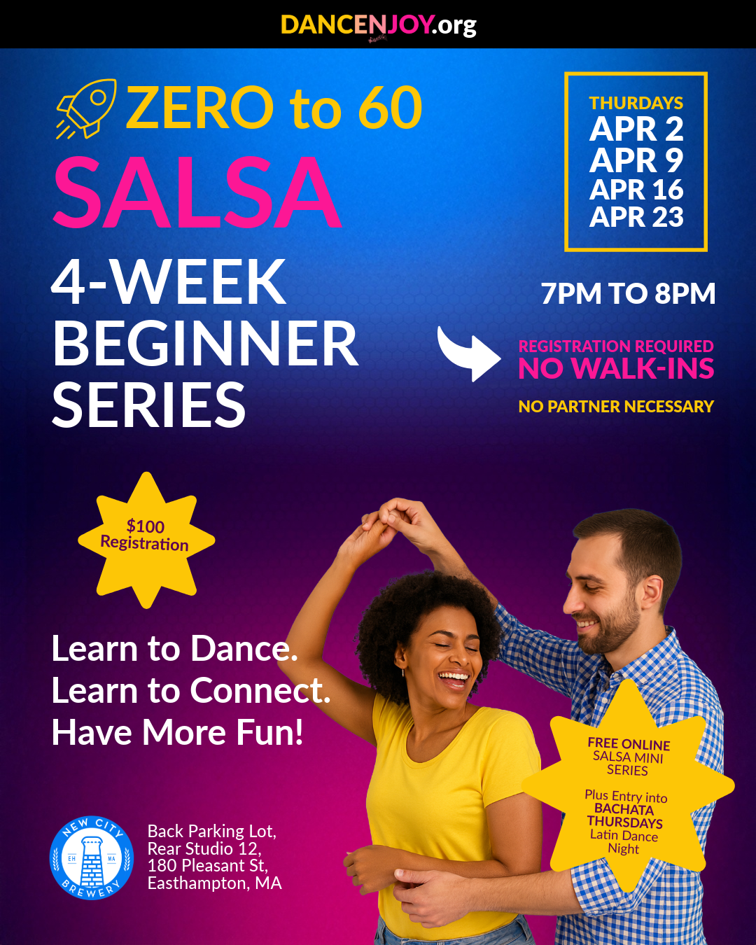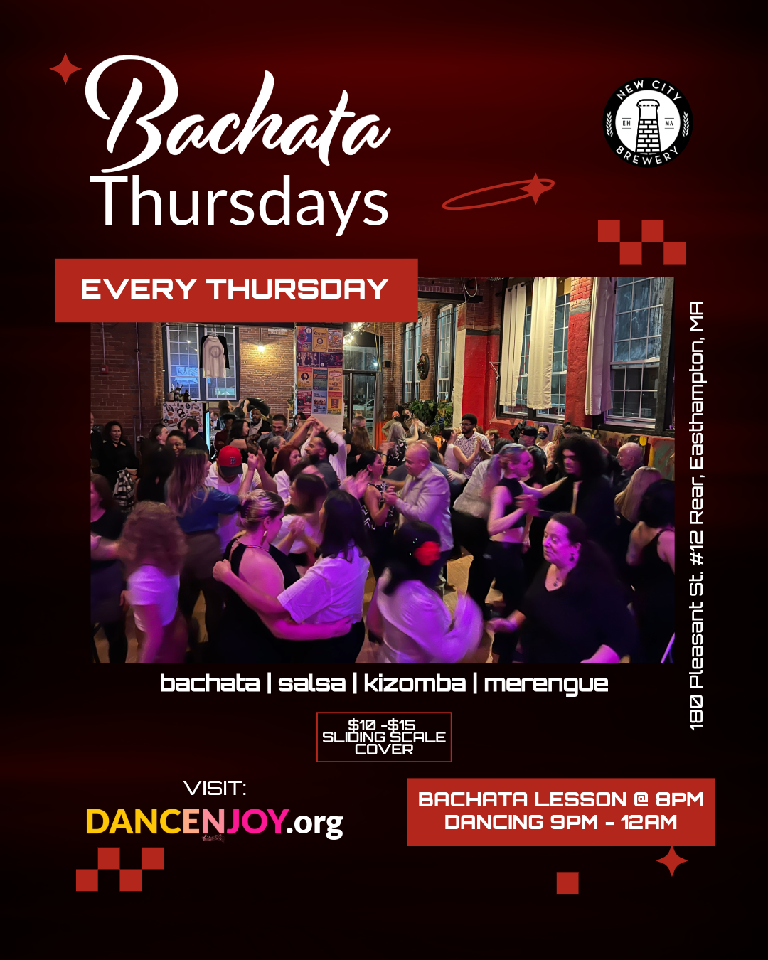 We recommend that you arrive early! This event gives you the chance to connect, dance, and enjoy an unforgettable Sunday night of Salsa, Bachata, and more in the heart of Easthampton. Plus, it’s the perfect opportunity to go dancing earlier than usual and still be home at a good hour.